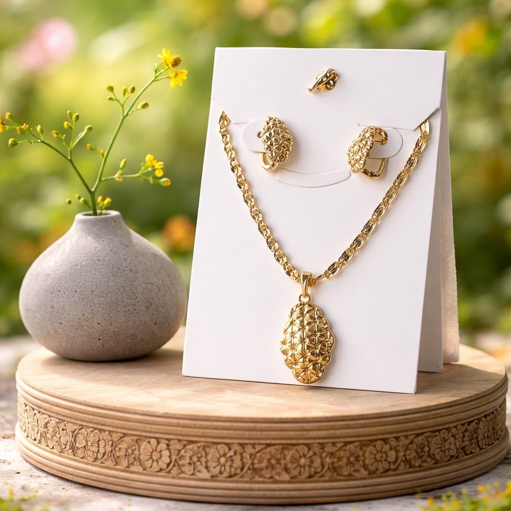 Kit Cadena Dije Aretes Piñas pertenece a la categoría Oro y subcategoría Kit. Es un accesorio pensado para aportar presencia, versatilidad y una presentación atractiva tanto en tienda como en catálogo online. Disponible en talla única.