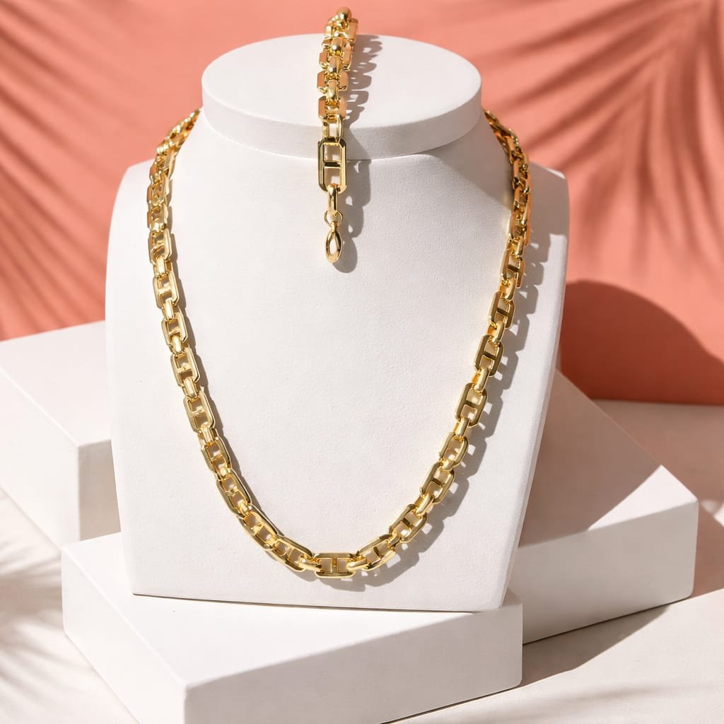 Set Collar y Pulsera Imitacion Gucci Grande Martillado pertenece a la categoría Oro y subcategoría Set. Es un accesorio pensado para aportar presencia, versatilidad y una presentación atractiva tanto en tienda como en catálogo online. Disponible en talla única.